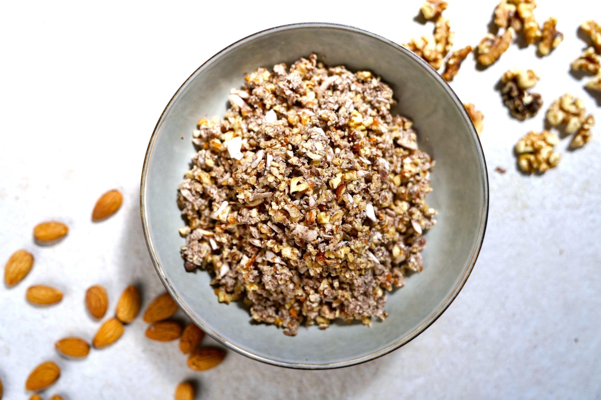 An explainer on how to make nut ‘mince’ (coarsely-ground nuts). Use for family favourites, like spaghetti bolognase.