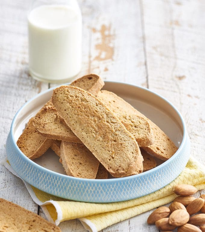 - Bake for 20–25 minutes. Remove from oven, cool slightly and cut into 1cm thick slices whilst still slightly soft. Return to oven for another 20 minutes. Cool completely before serving.