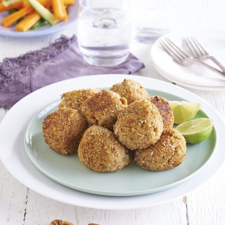 - Form the cooked rice mixture into 8 balls, enclosing a little pine nut filling in each. Roll balls in mixed nut meal. Refrigerate for 20 minutes.