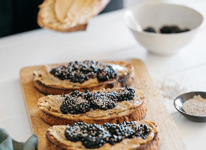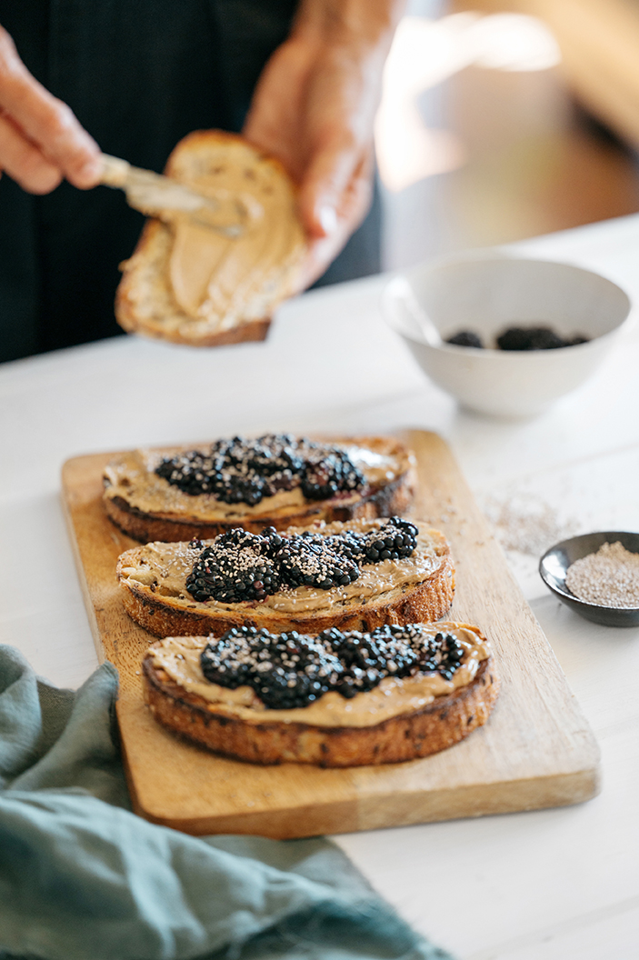 - Dot blackberries on top of nut butter, squishing some so they ooze juice.