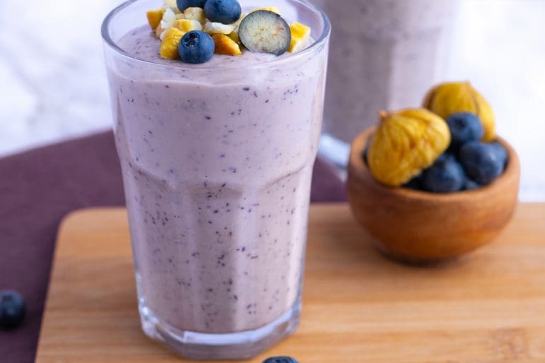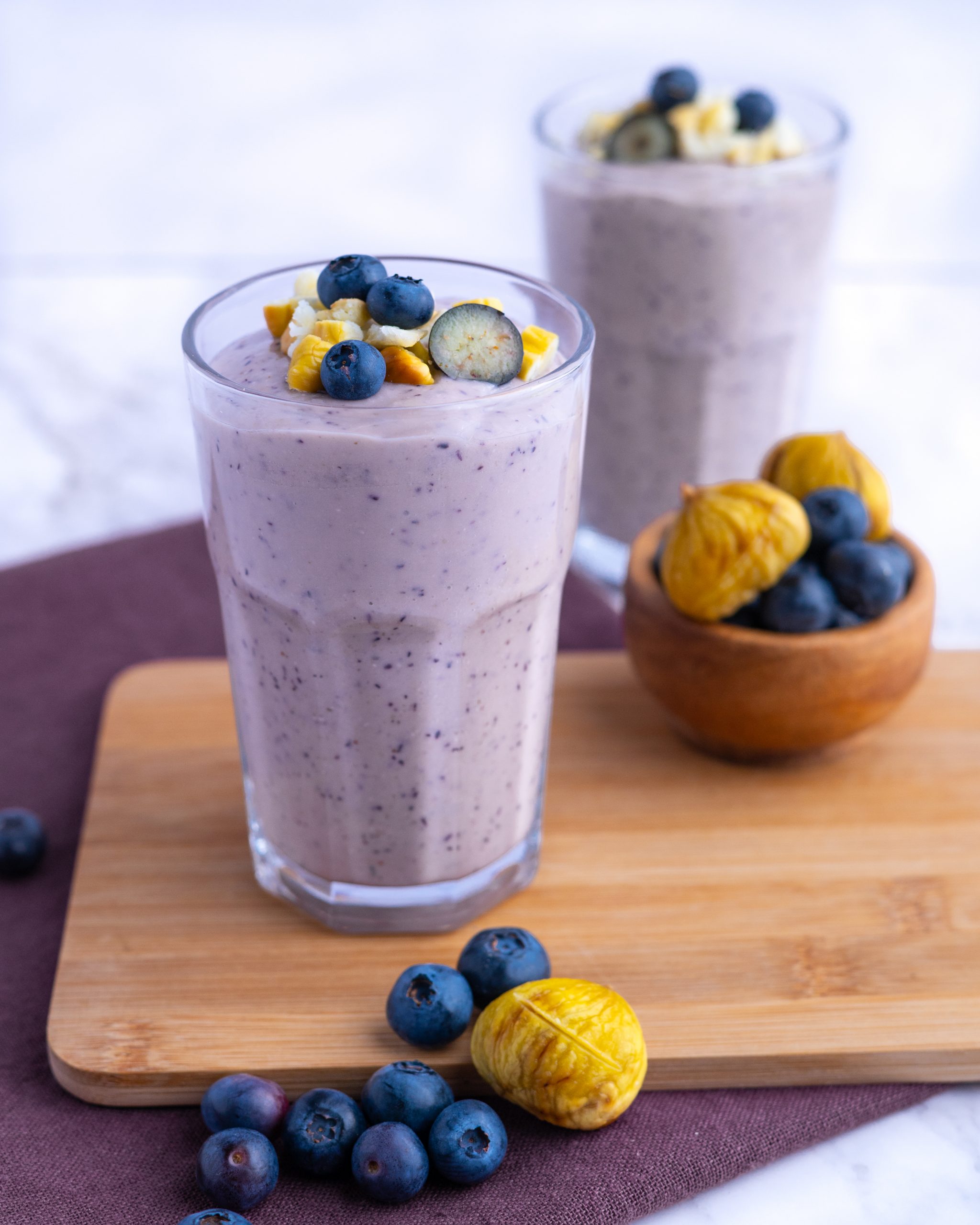 - Serve in tall glasses garnished with extra blueberries and chopped chestnuts.