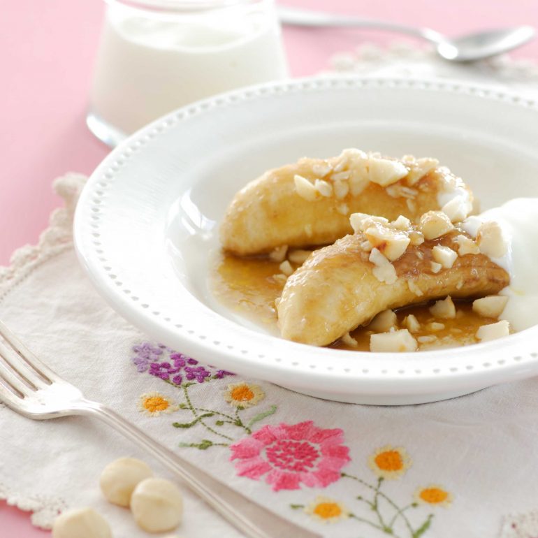 - Sprinkle liberally with macadamias and serve with a spoonful of the low-fat Greek style yoghurt.