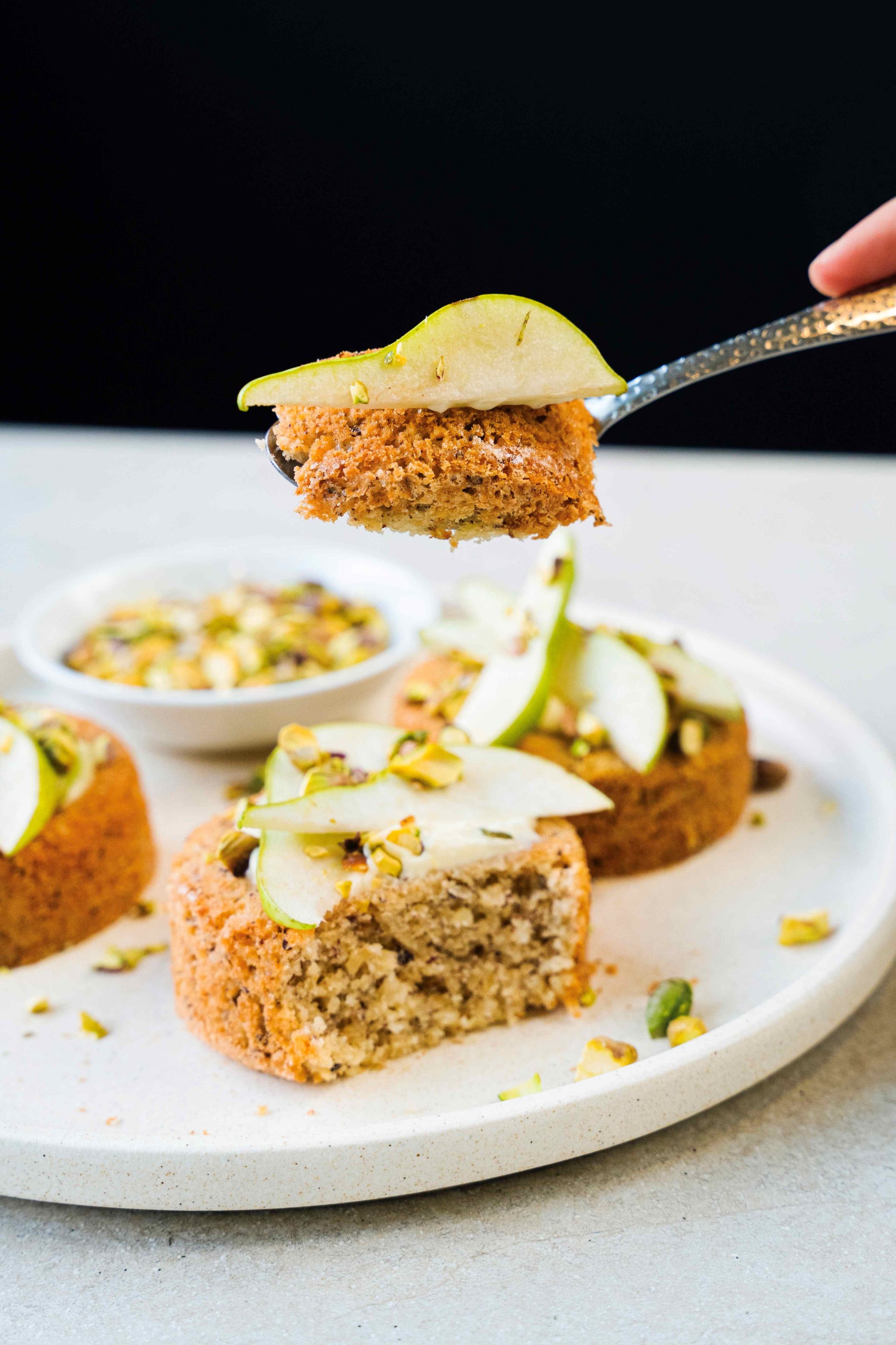 - Serve cakes warm with a dollop of crème fraiche, pear, and a sprinkle of chopped pistachios.