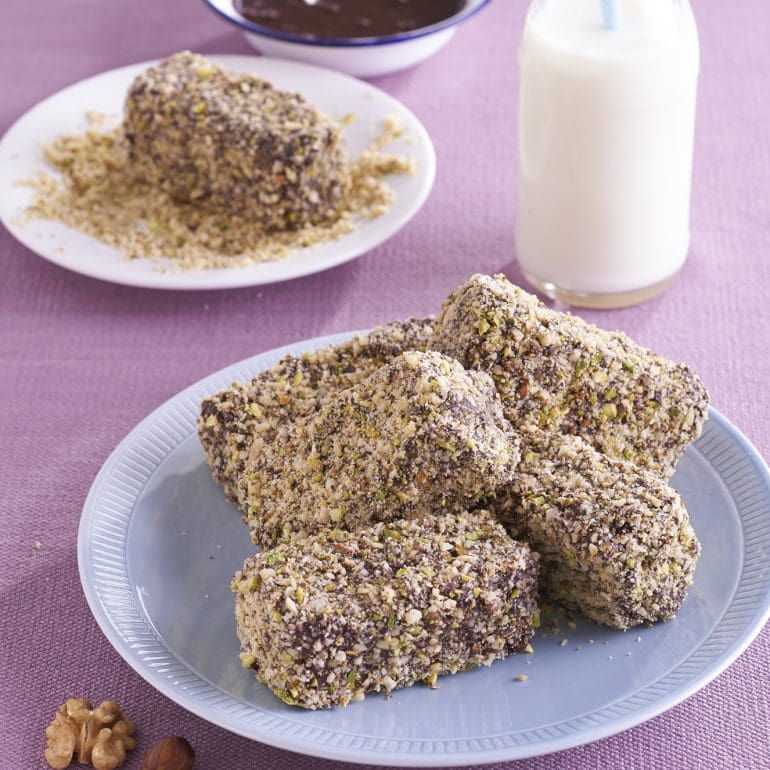 - Drain excess icing then roll in crushed nuts. Place on a wire rack until firm and serve.
