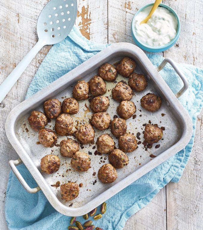 - Bake the meatballs for 15-20 minutes or until browned and cooked through. Cool slightly then serve with cucumber yoghurt.