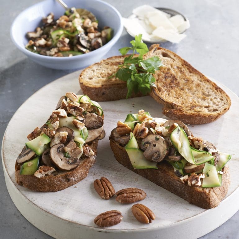 - Top each slice with zucchini ribbons, mushrooms and pecans. Sprinkle with parmesan cheese to serve.