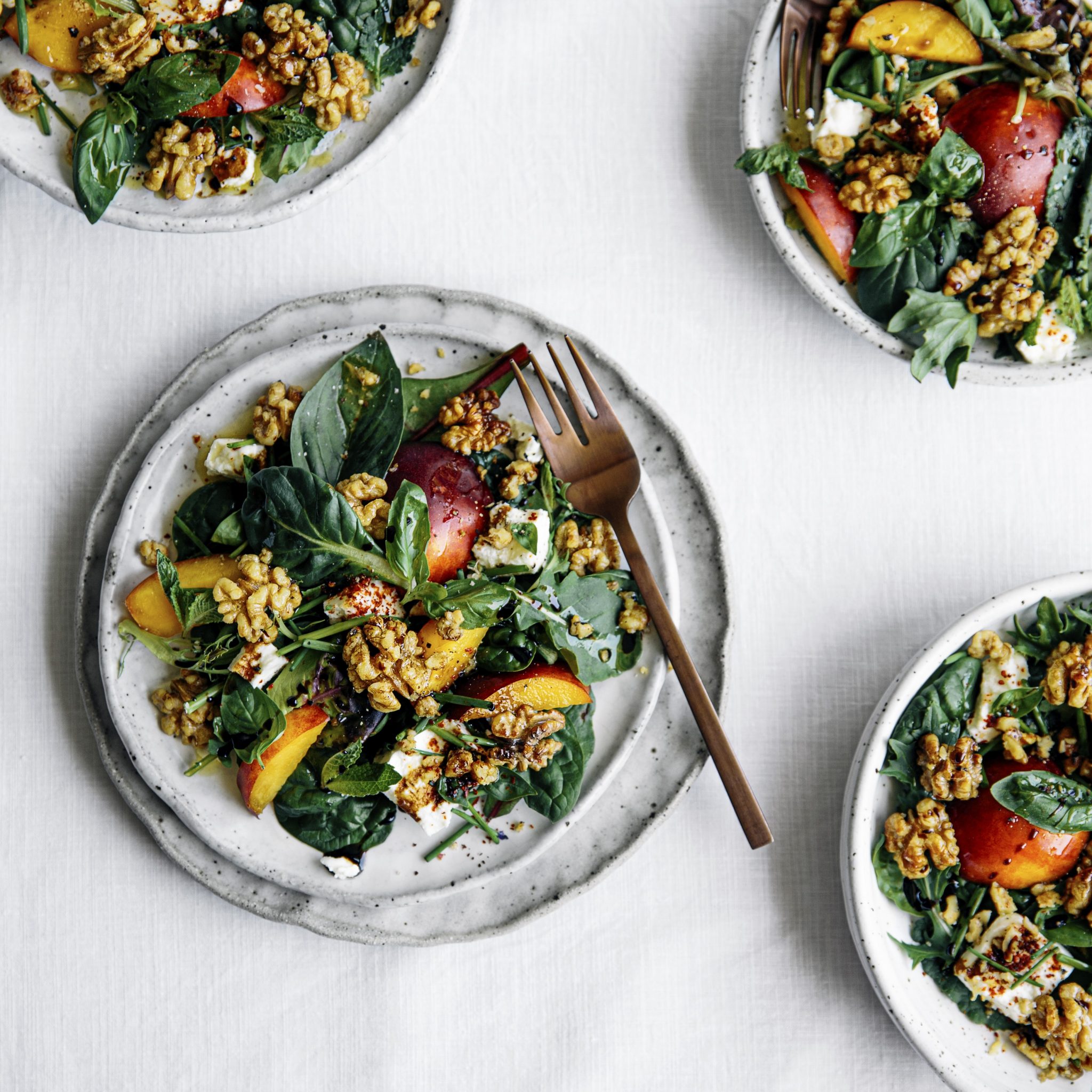 - Arrange the nectarines on top and crumble on the goats’ cheese, then sprinkle over half of the toasted walnuts.