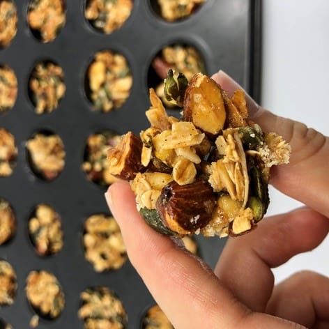 Spray the muffin holder really well and allow the nut clusters to cool completely before trying to remove them from the muffin tray – otherwise they break apart.
