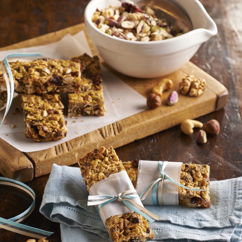 - Place all the ingredients together in a large bowl. Toss well until fully combined and mixture is clumpy. Press into prepared baking tin.