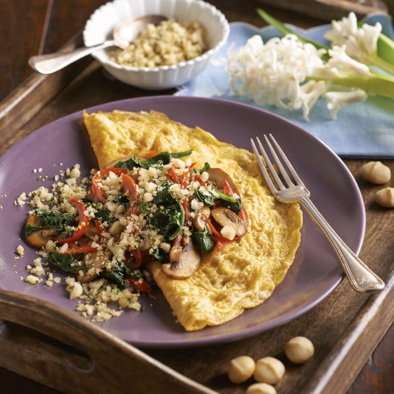 - Combine the parsley, lemon rind and macadamias in a separate bowl. Transfer the omelette to a plate, spoon over sauteed mushroom mixture and then top with the macadamia mix.