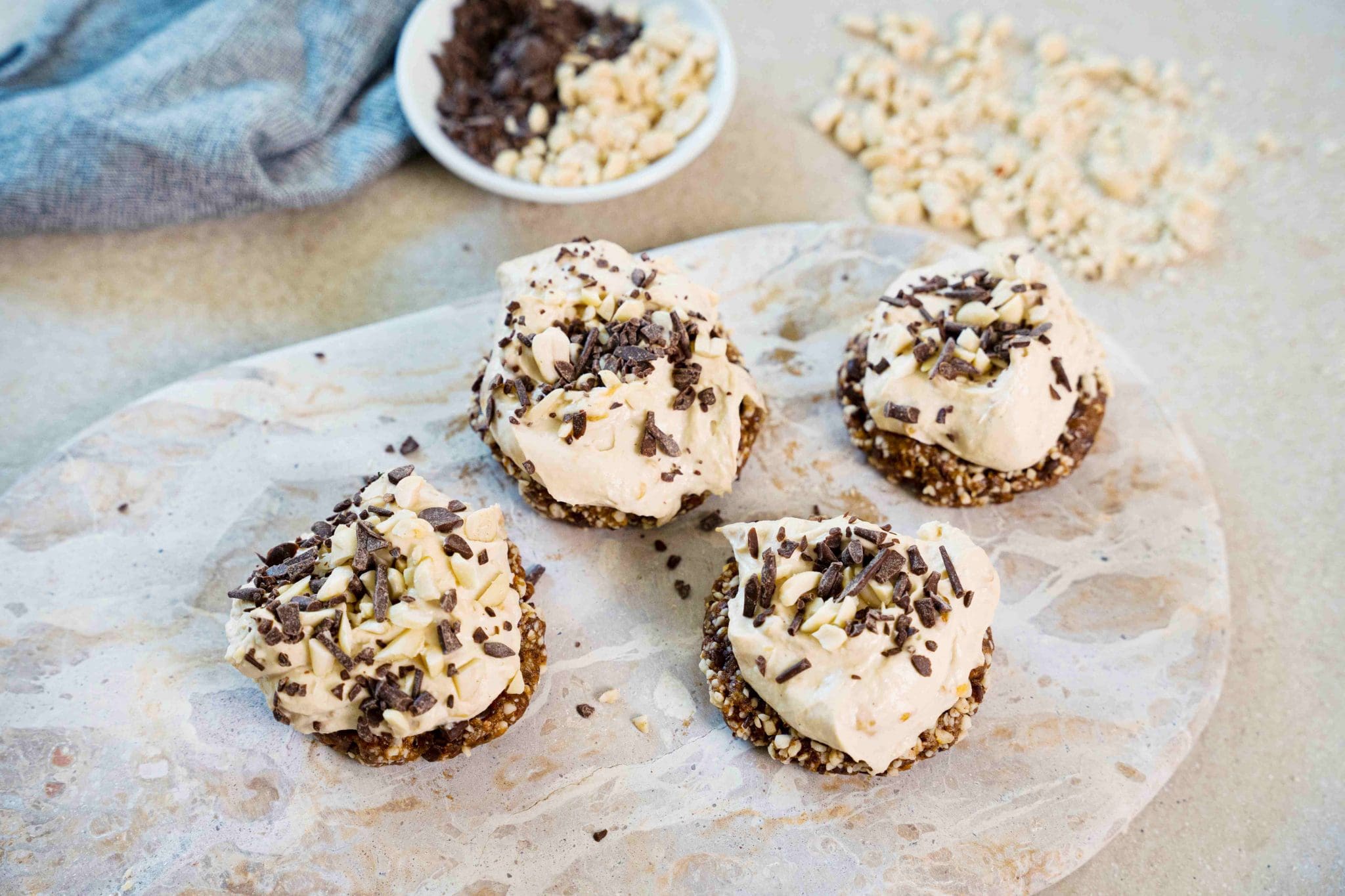 - Spoon or pipe cheesecake mixture evenly on top of the four peanut 'bases', and garnish with remaining dark chocolate and peanuts.