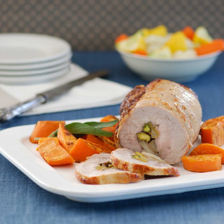 Roast pork loin with chestnut, pistachio and apricot stuffing
