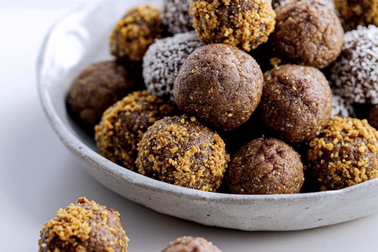 - Add the remaining walnuts, oats, coconut, dates, maple syrup, cinnamon, and sea salt, and blend until combined and the mixture forms a smooth ball in the food processor.