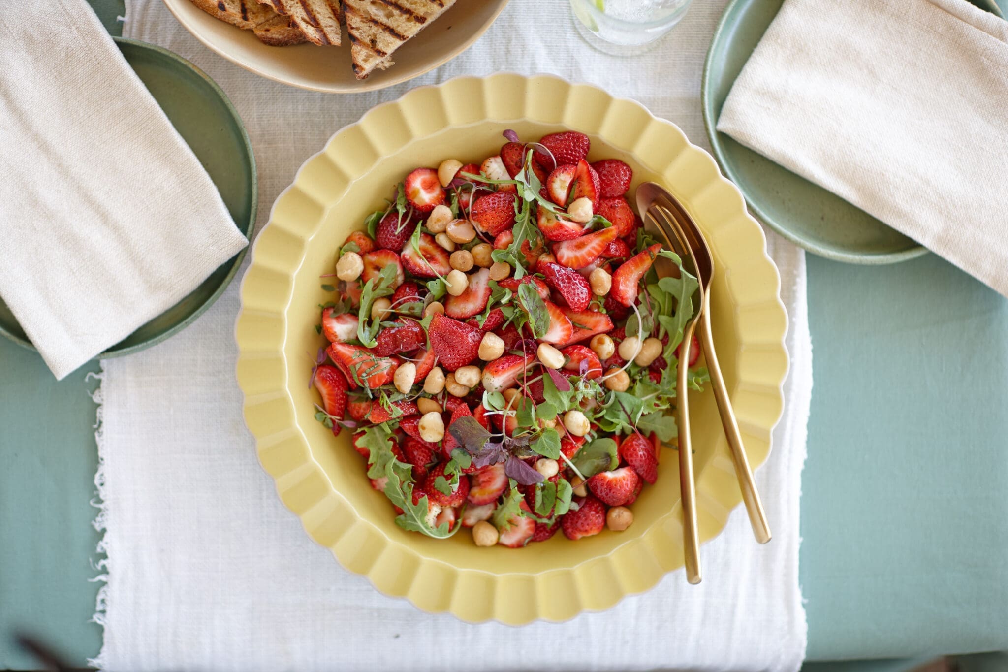 - Place the strawberries, basil and salad leaves in a serving bowl.