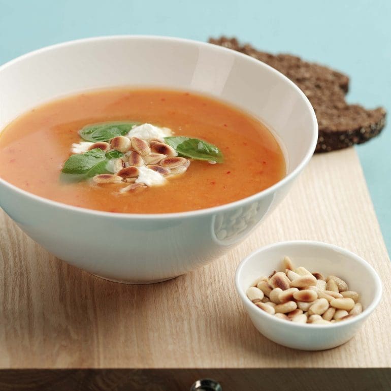 Sweet potato soup with feta and pine nuts