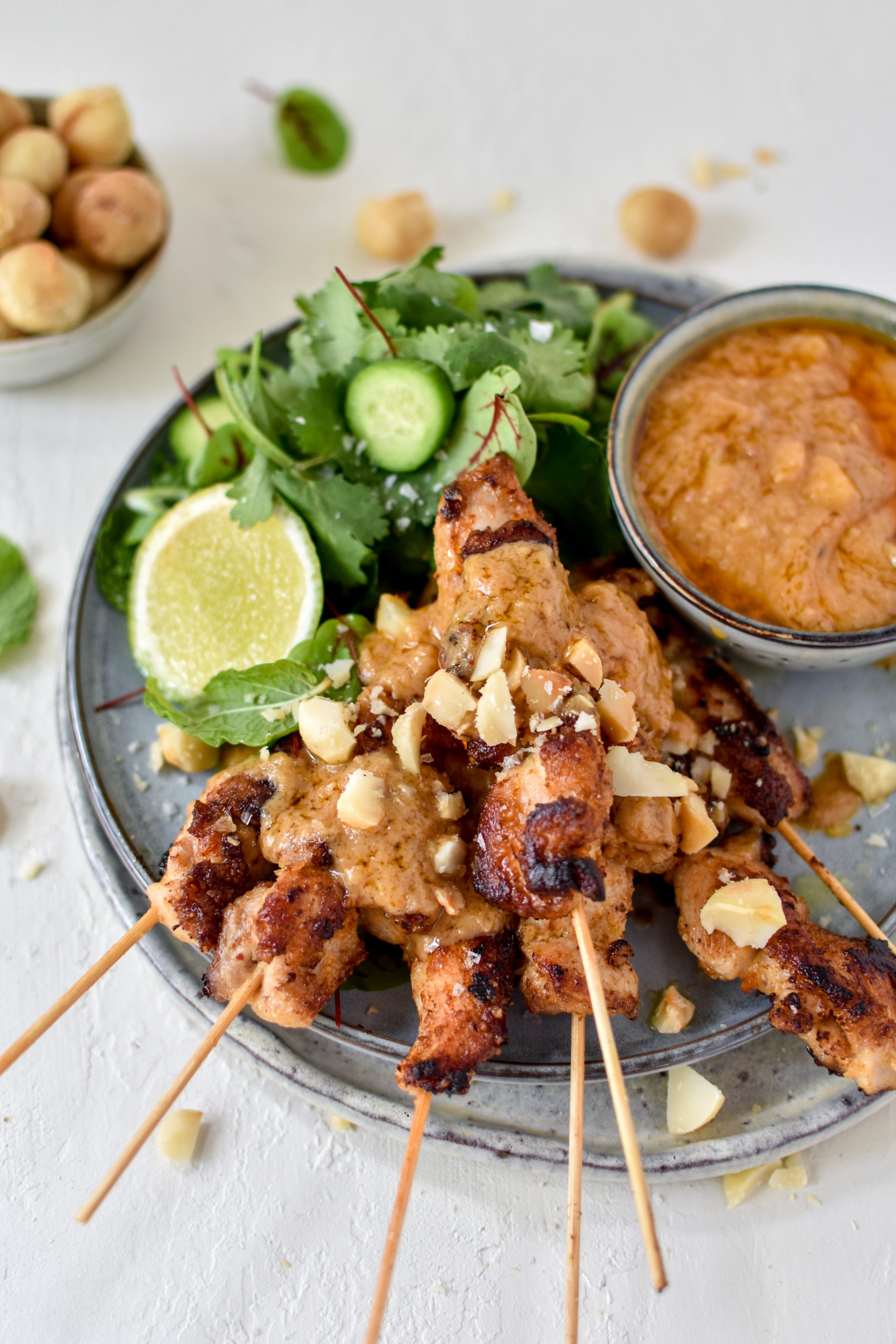 - Arrange the hot chicken skewers onto a serving plate. Drizzle with the satay sauce. Garnish with the herb salad and roasted macadamias.