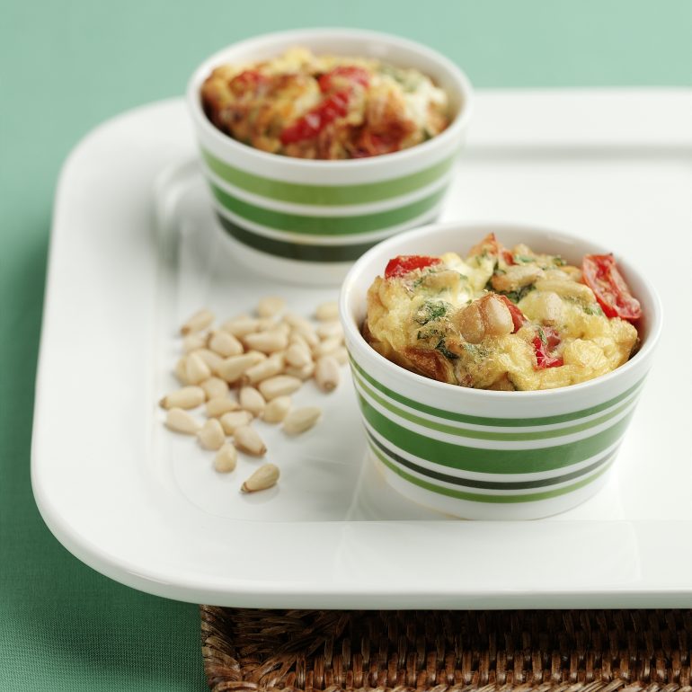 - Divide mixture between the ramekins. Place a few cherry tomato pieces in each ramekin.
