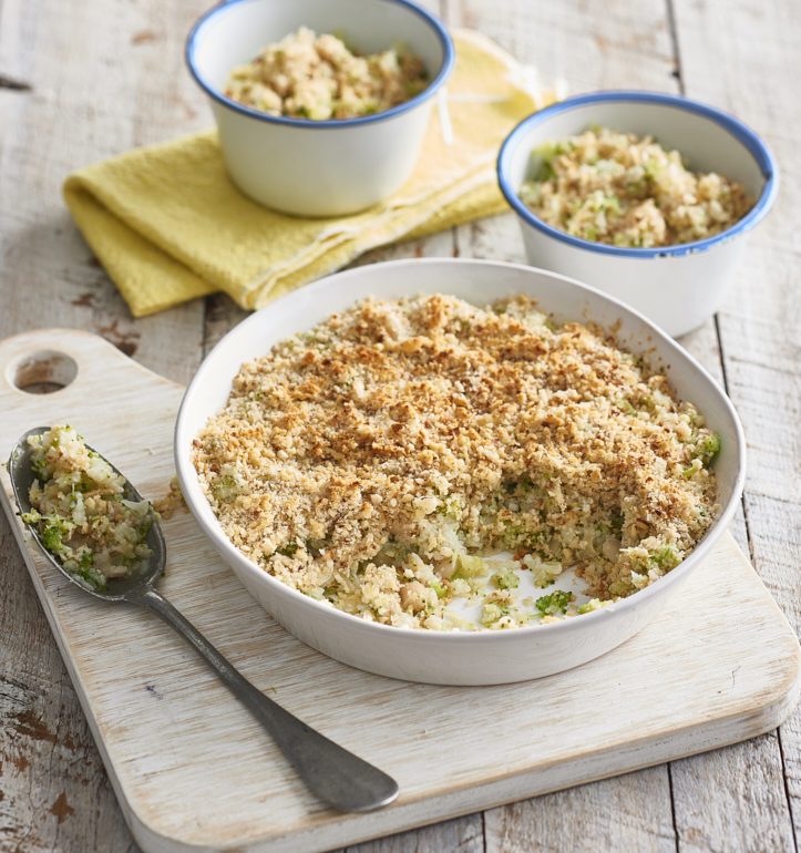 - Steam the cauliflower and broccoli until tender. Cool slightly then place in a food processor with the beans and ¼ cup water and pulse until desired texture. Transfer to a medium size ovenproof dish.