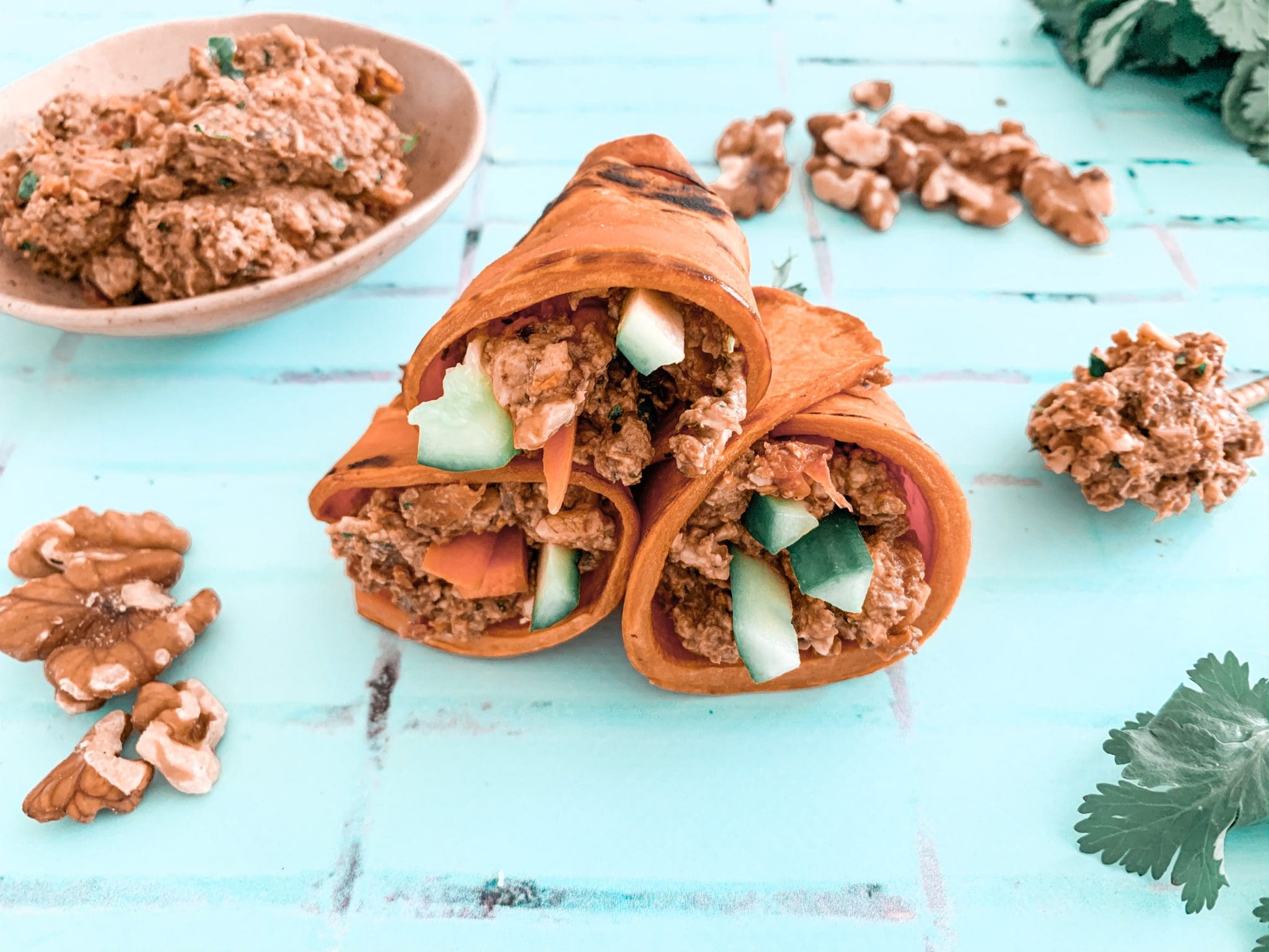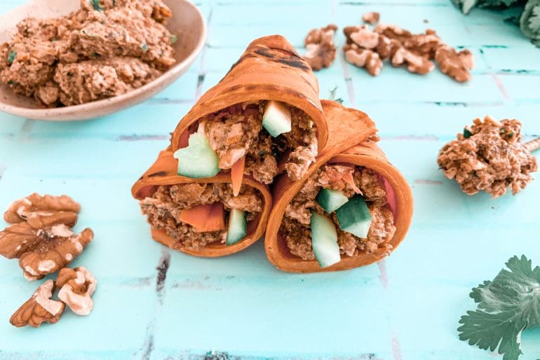 - Lay sweet potato slices individually onto a chopping board. Divide walnut mixture evenly to spread on top of each sweet potato slice. Top with carrot, cucumber and avocado.