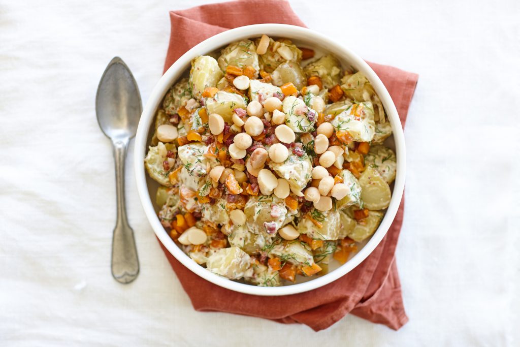 Every bite of this indulgent potato salad is infused with the buttery flavour and delectable crunch of macadamias. For vegetarians, remove the pancetta (the creamy deliciousness of this recipe will hold up without it!), or use a handful of grated parmessan cheese instead.