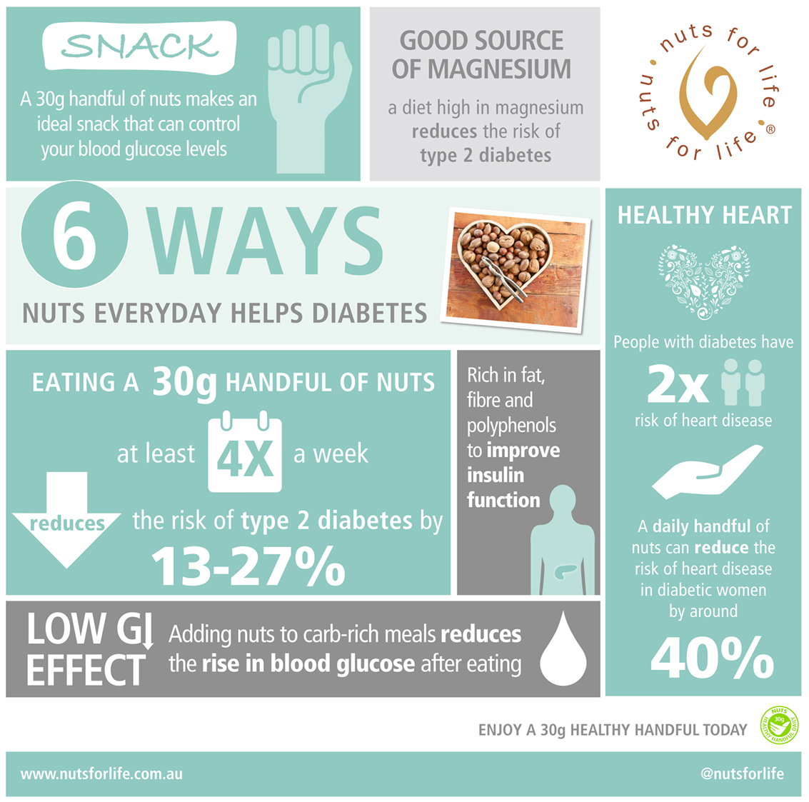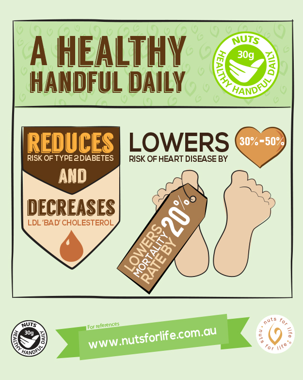 The daily habit of a handful of nuts offers some major health benefits! We’d love you to download and share our nuts and health infographics. Please credit all with ‘Image courtesy of Nuts for Life’.